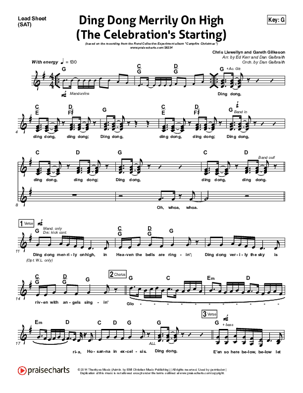 Download the sheet music for Ding Dong Merrily On High by Rend Collective, from the album Campfire Christmas. This song was arranged by Ed Kerr / Daniel Galbraith in the key of F, G.