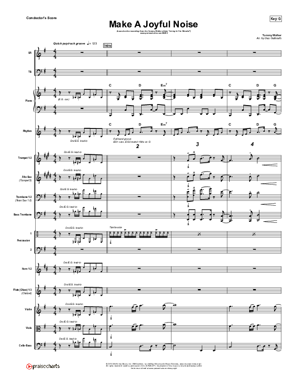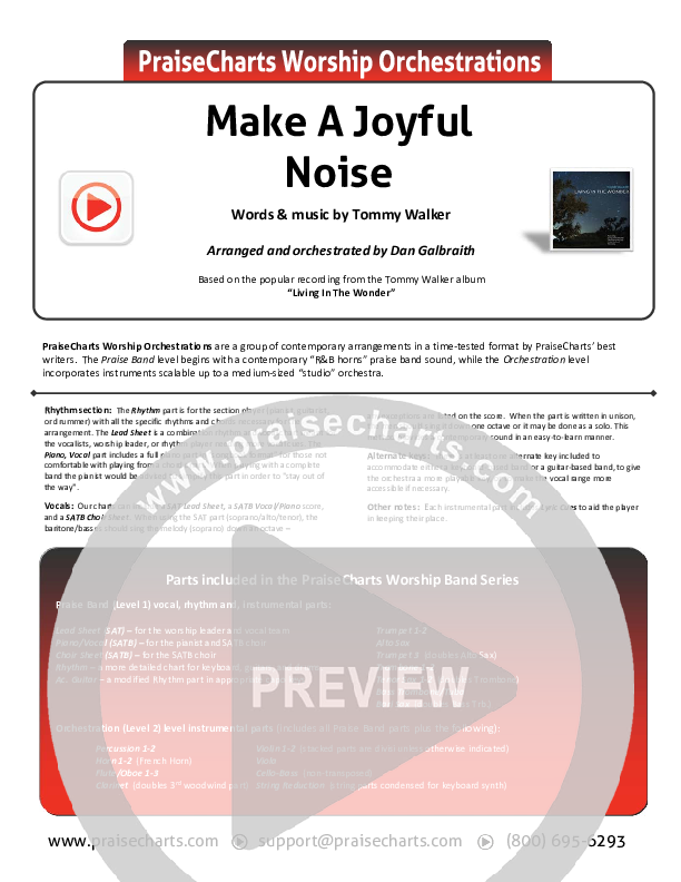 Download the Orchestration for Make A Joyful Noise by Tommy Walker, from the album Living In The Wonder. This song was arranged by Daniel Galbraith in the key of F, G.