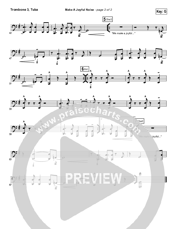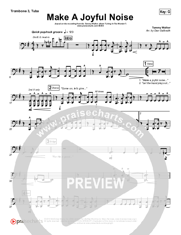 Download the Trombone 3/Tuba sheet music for Make A Joyful Noise by Tommy Walker, from the album Living In The Wonder. This song was arranged by Daniel Galbraith in the key of F, G.