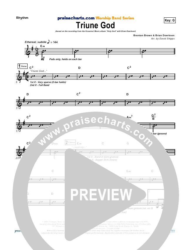 Download the sheet music for Triune God by Brian Doerksen, from the album Holy God. This song was arranged by David Shipps in the key of F, G.