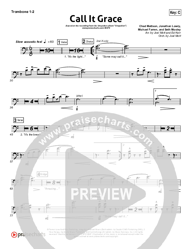 Download the Trombone 1,2 sheet music for Call It Grace by Unspoken, from the album Unspoken. This song was arranged by Ed Kerr / Joel Mott in the key of A, Ab, Bb, C, E, F.