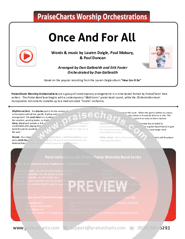 Download the Orchestration for Once And For All by Lauren Daigle, from the album How Can It Be. This song was arranged by Daniel Galbraith / Erik Foster in the key of A, B, Bb, C.