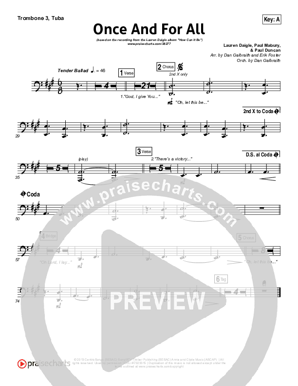 Download the Trombone 3/Tuba sheet music for Once And For All by Lauren Daigle, from the album How Can It Be. This song was arranged by Daniel Galbraith / Erik Foster in the key of A, B, Bb, C.
