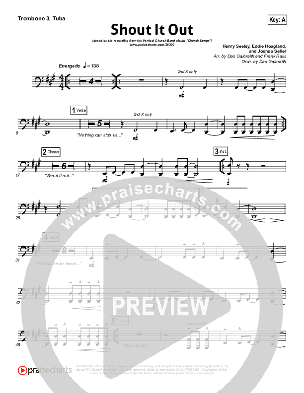 Download the Trombone 3/Tuba sheet music for Shout It Out by Vertical Worship, from the album Church Songs. This song was arranged by Daniel Galbraith / Frank Ralls in the key of A, G.