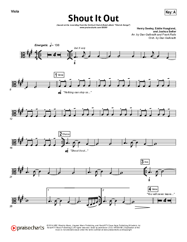 Download the Viola sheet music for Shout It Out by Vertical Worship, from the album Church Songs. This song was arranged by Daniel Galbraith / Frank Ralls in the key of A, G.