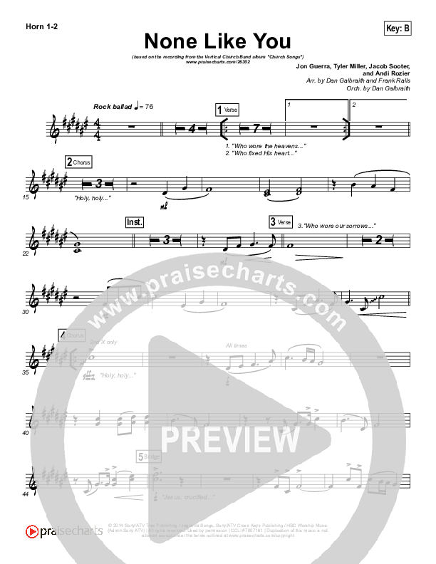 Download the Orchestration brass parts for None Like You by Vertical Worship, from the album Church Songs. This song was arranged by Daniel Galbraith / Frank Ralls in the key of B, Bb.