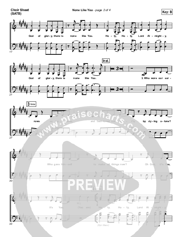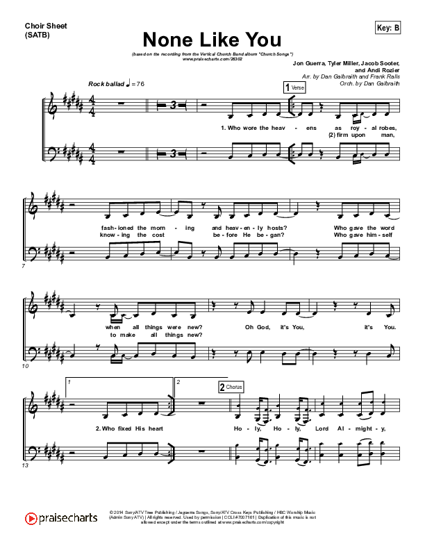 Download the Choir Sheet for None Like You by Vertical Worship, from the album Church Songs. This song was arranged by Daniel Galbraith / Frank Ralls in the key of B, Bb.
