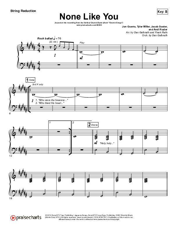 Download the Orchestration for None Like You by Vertical Worship, from the album Church Songs. This song was arranged by Daniel Galbraith / Frank Ralls in the key of B, Bb.