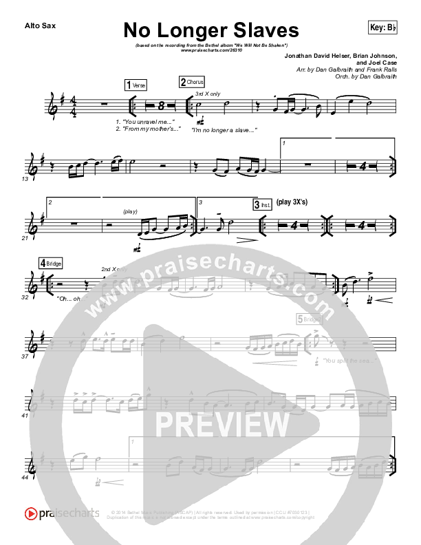 Download the AltoSax sheet music for No Longer Slaves (Spontaneous)(Live) by Bethel Music, from the album We Will Not Be Shaken. This song was arranged by Daniel Galbraith in the key of A, Ab, B, Bb, C, G.