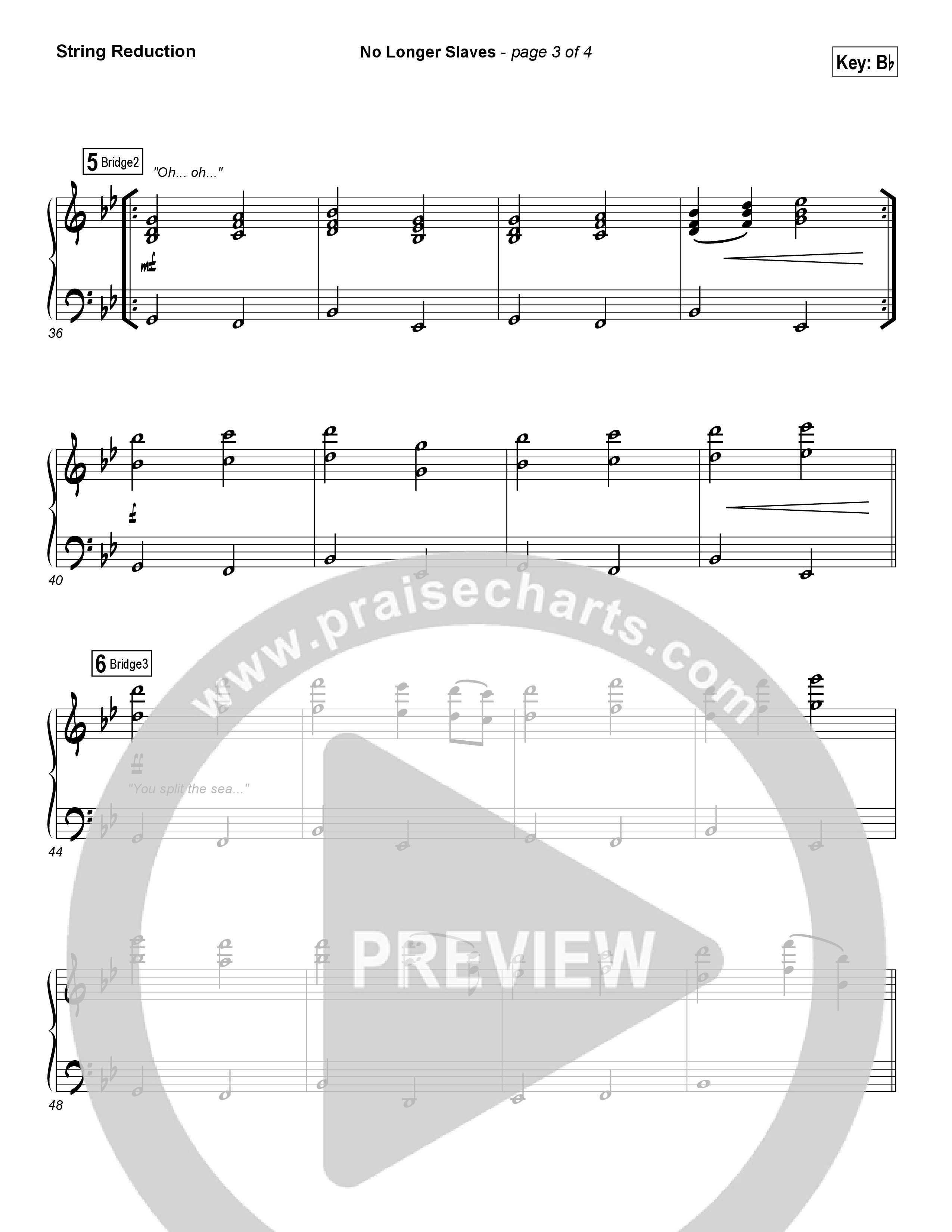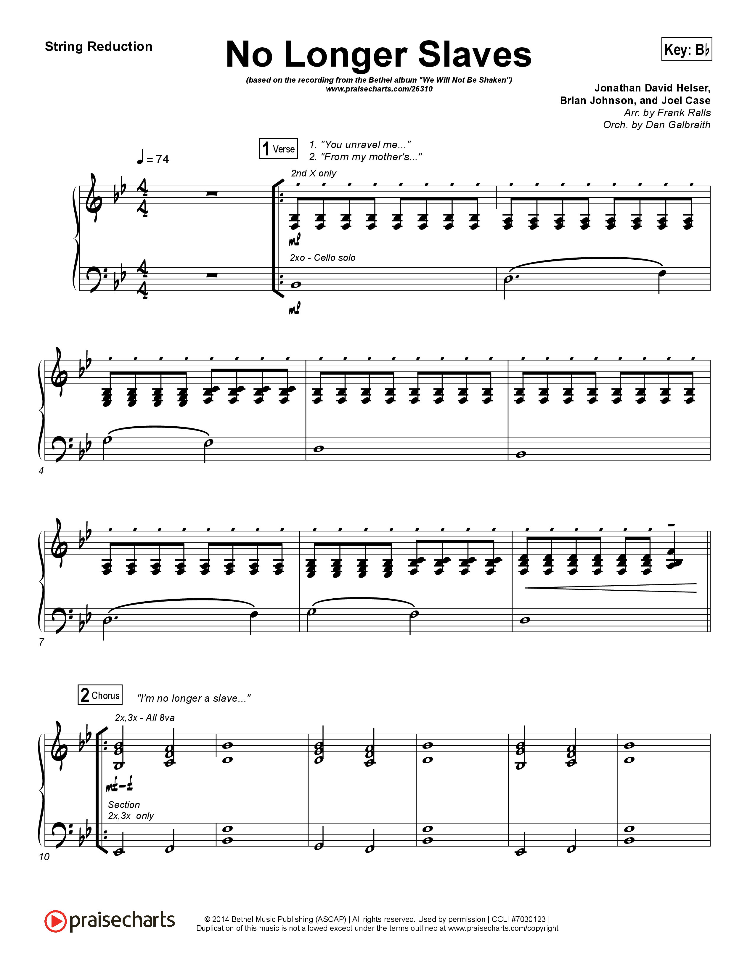 Download the Orchestration for No Longer Slaves (Spontaneous)(Live) by Bethel Music, from the album We Will Not Be Shaken. This song was arranged by Daniel Galbraith in the key of A, Ab, B, Bb, C, G.