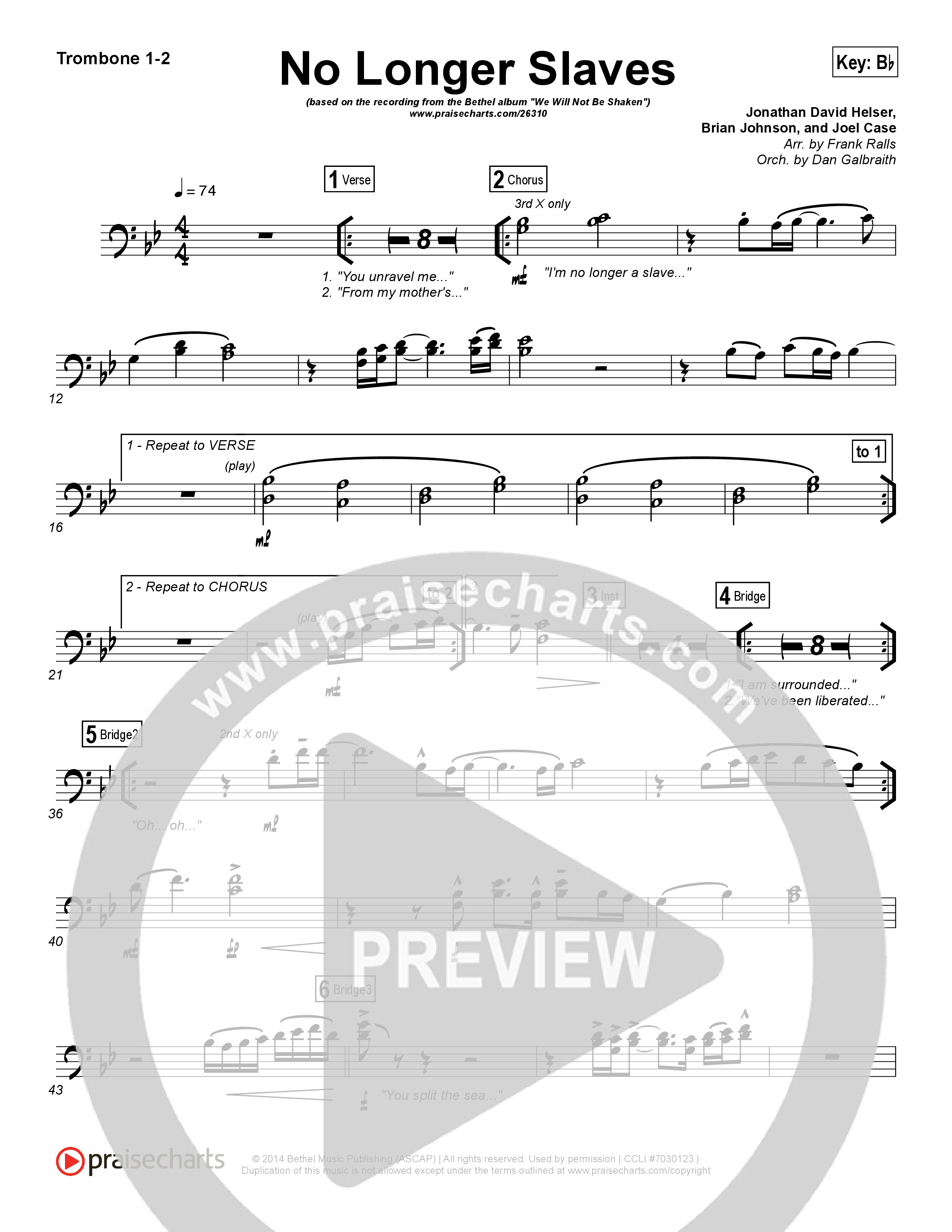 Download the Trombone 1,2 sheet music for No Longer Slaves (Spontaneous)(Live) by Bethel Music, from the album We Will Not Be Shaken. This song was arranged by Daniel Galbraith in the key of A, Ab, B, Bb, C, G.
