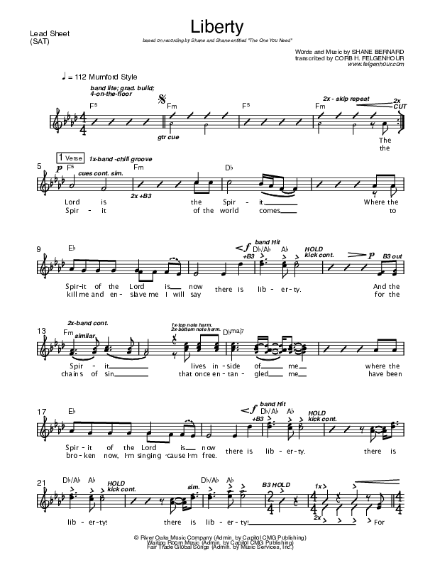 Download the sheet music for Liberty by Shane & Shane, from the album The One You Need. This song was arranged by Corb Felgenhour in the key of Ab.