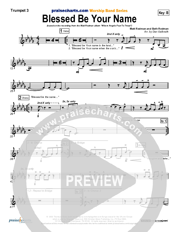 Download the Trumpet 3 sheet music for Blessed Be Your Name by Matt Redman, from the album Where Angels Fear To Tread. This song was arranged by Daniel Galbraith in the key of B, Bb.