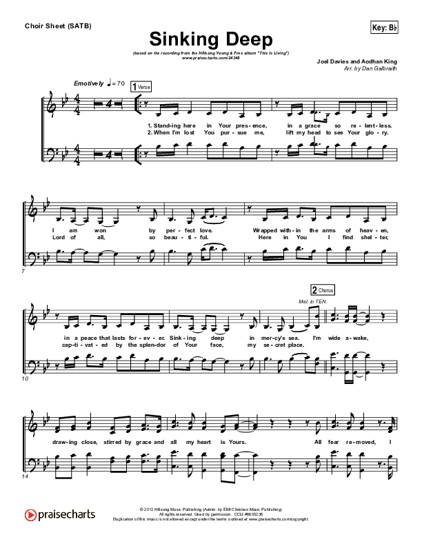 Download the Choir Sheet for Sinking Deep by Hillsong Young & Free, from the album This Is Living. This song was arranged by Daniel Galbraith in the key of Bb, C.