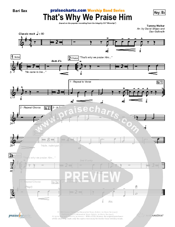 Download the Bari Sax sheet music for That's Why We Praise Him by Tommy Walker, from the album iWorship CD (Vol. 1). This song was arranged by David Shipps / Daniel Galbraith in the key of Bb, C.