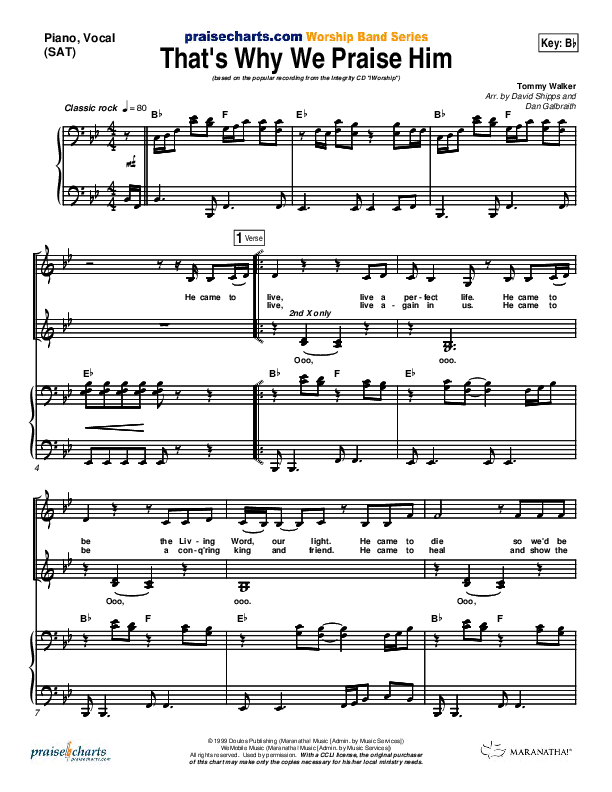 Download the sheet music for That's Why We Praise Him by Tommy Walker, from the album iWorship CD (Vol. 1). This song was arranged by David Shipps / Daniel Galbraith in the key of Bb, C.