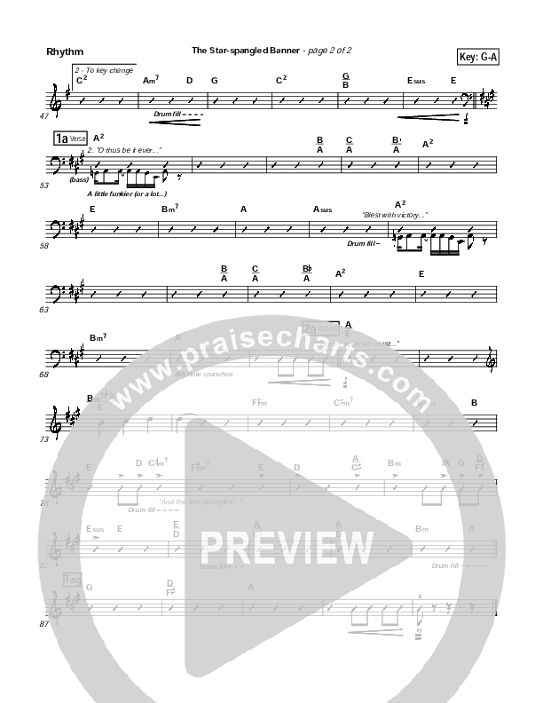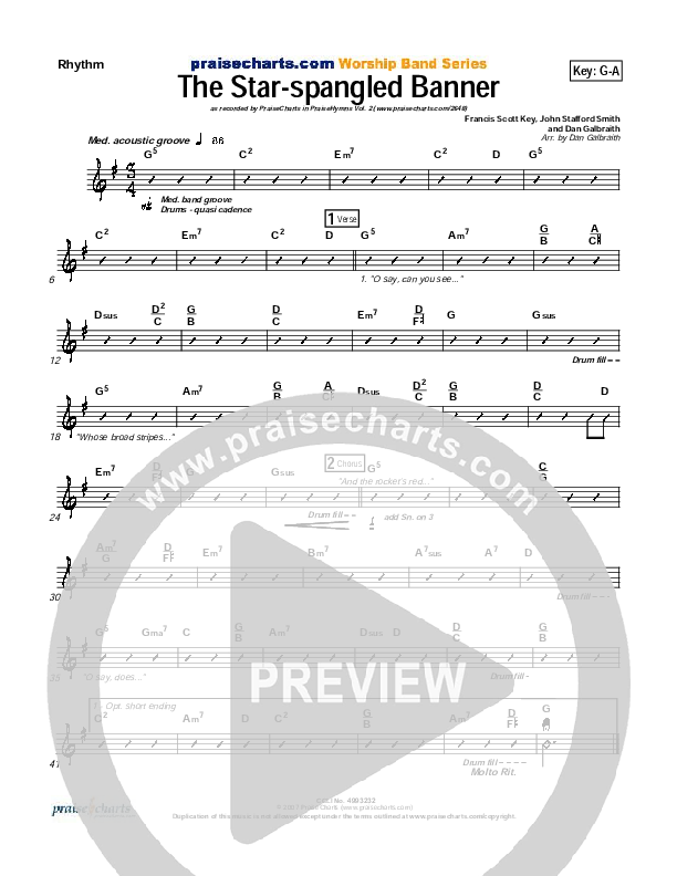 Download the Rhythm Chart for The Star-Spangled Banner by PraiseCharts Band / Arr. Daniel Galbraith, from the album Patriotic PraiseHymns. This song was arranged by Daniel Galbraith in the key of Ab, G.