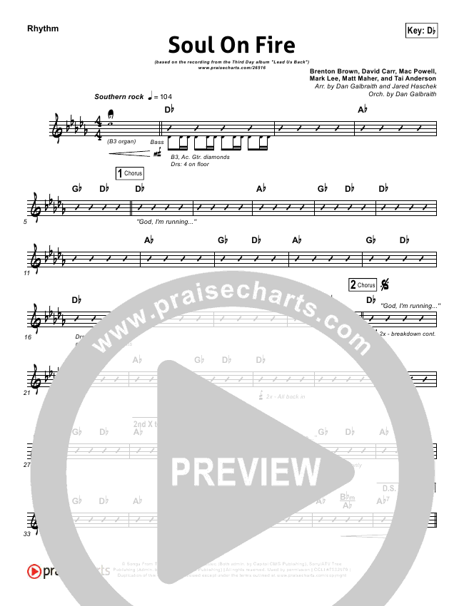 Download the Rhythm Chart for Soul On Fire by Third Day, from the album Lead Us Back. This song was arranged by Daniel Galbraith / Jared Haschek in the key of A, Ab, Bb, C, Db, G.