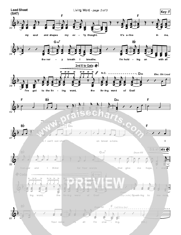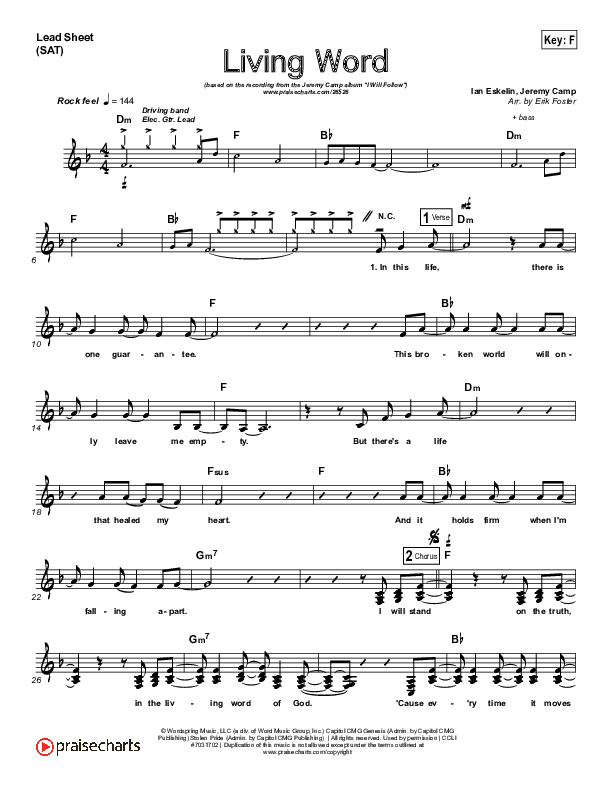 Download the sheet music for Living Word by Jeremy Camp, from the album I Will Follow. This song was arranged by Erik Foster in the key of F, G.