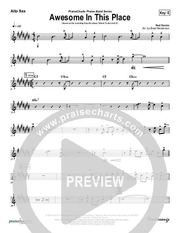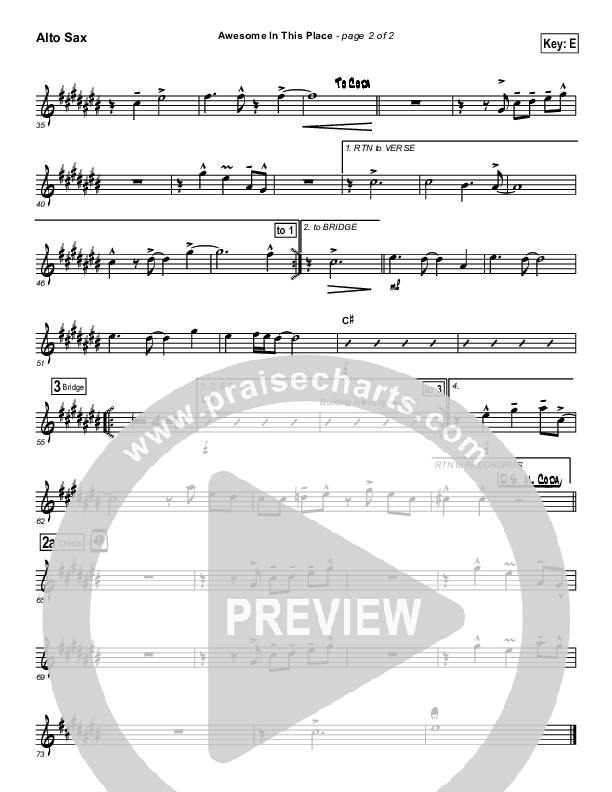 Download the AltoSax sheet music for Awesome in this Place by Hillsong Worship, from the album For This Cause. This song was arranged by Brad Henderson in the key of E, F.
