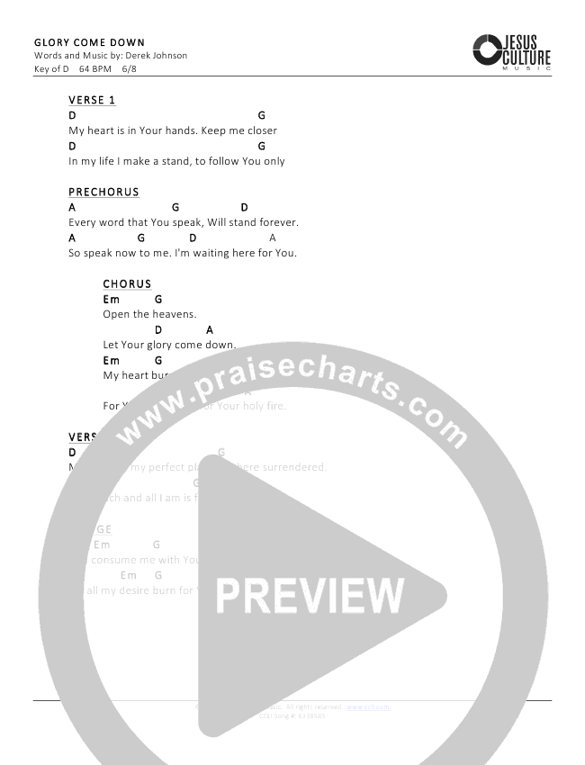 Download the PDF Chord Charts for Glory Come Down by Derek Johnson, from the album Real Love.