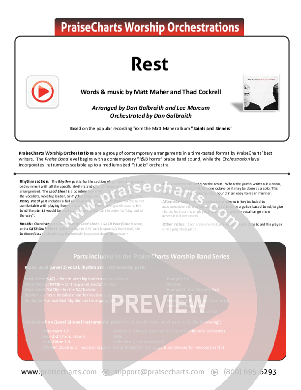 Download the Orchestration for Rest by Matt Maher, from the album Saints & Sinners. This song was arranged by Daniel Galbraith in the key of F, Gb.