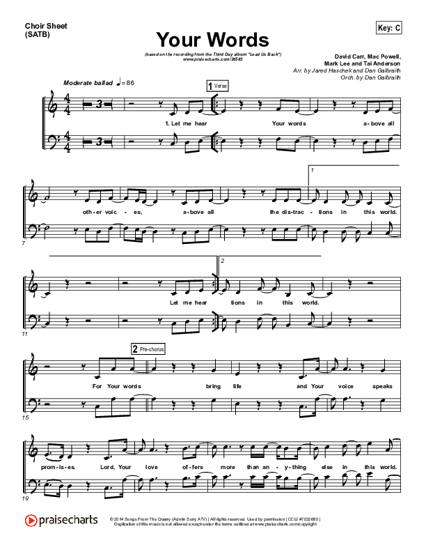 Download the Choir Sheet for Your Words by Third Day, from the album Lead Us Back. This song was arranged by Jared Haschek / Daniel Galbraith in the key of B, Bb, C, D, Eb.