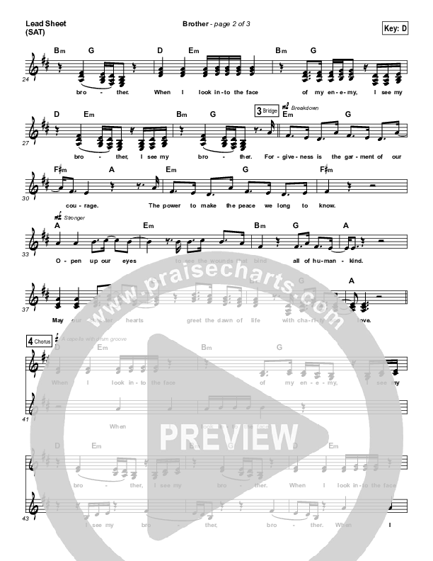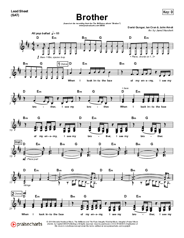 Download the sheet music for Brother by The Brilliance, from the album Brother. This song was arranged by Jared Haschek in the key of D, E.