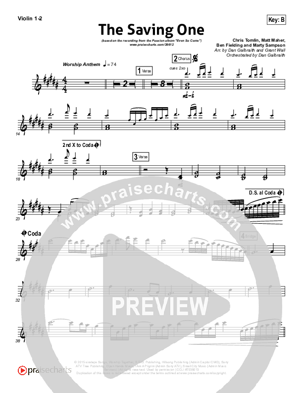 Download the Violin sheet music for The Saving One by Passion / Chris Tomlin, from the album Even So Come. This song was arranged by Daniel Galbraith / Grant Wall in the key of Ab, B, Bb.