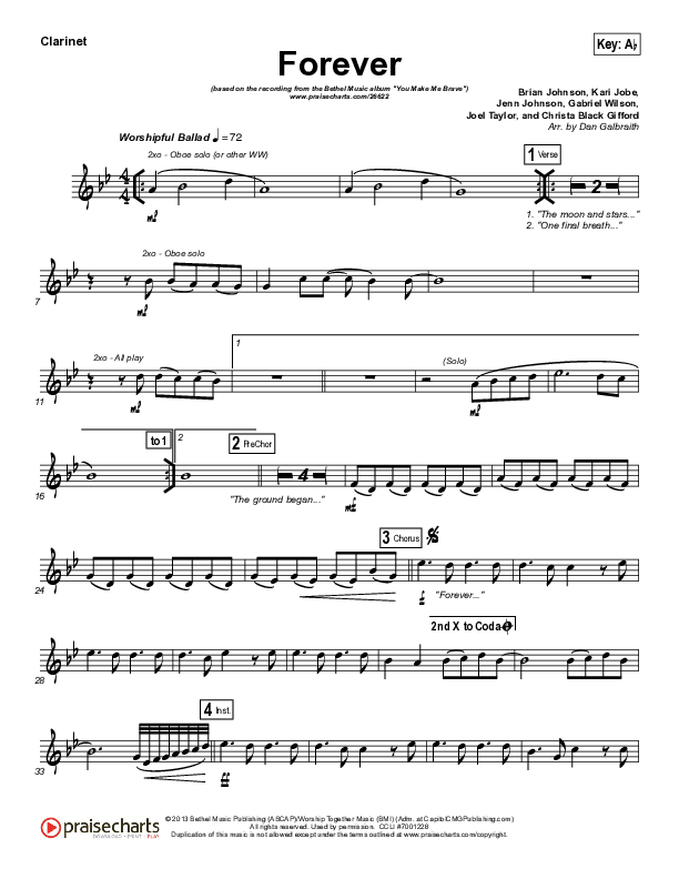 Download the Orchestration for Forever by Bethel Music, from the album You Make Me Brave - Live At The Civic. This song was arranged by Daniel Galbraith in the key of A, Ab.