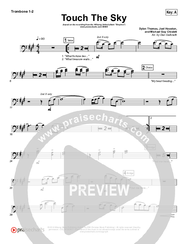 Download the Trombone 1,2 sheet music for Touch The Sky by Hillsong UNITED, from the album Empires. This song was arranged by Daniel Galbraith in the key of A, Ab, B, Bb, C.