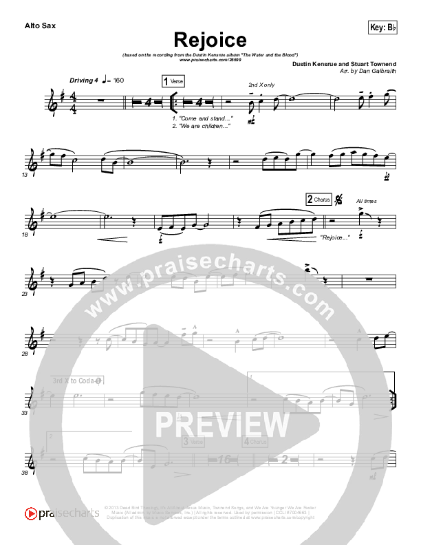 Download the AltoSax sheet music for Rejoice by Dustin Kensrue, from the album The Water And The Blood. This song was arranged by Daniel Galbraith in the key of A, Bb.