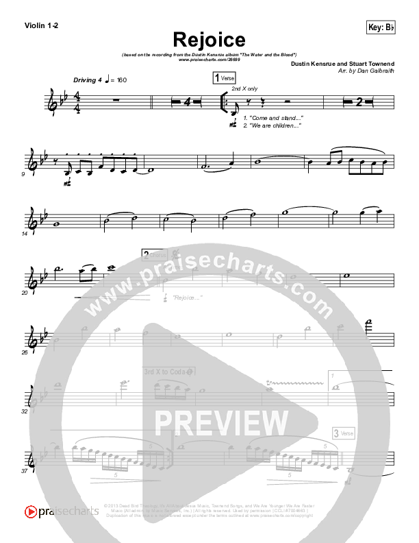 Download the Violin sheet music for Rejoice by Dustin Kensrue, from the album The Water And The Blood. This song was arranged by Daniel Galbraith in the key of A, Bb.