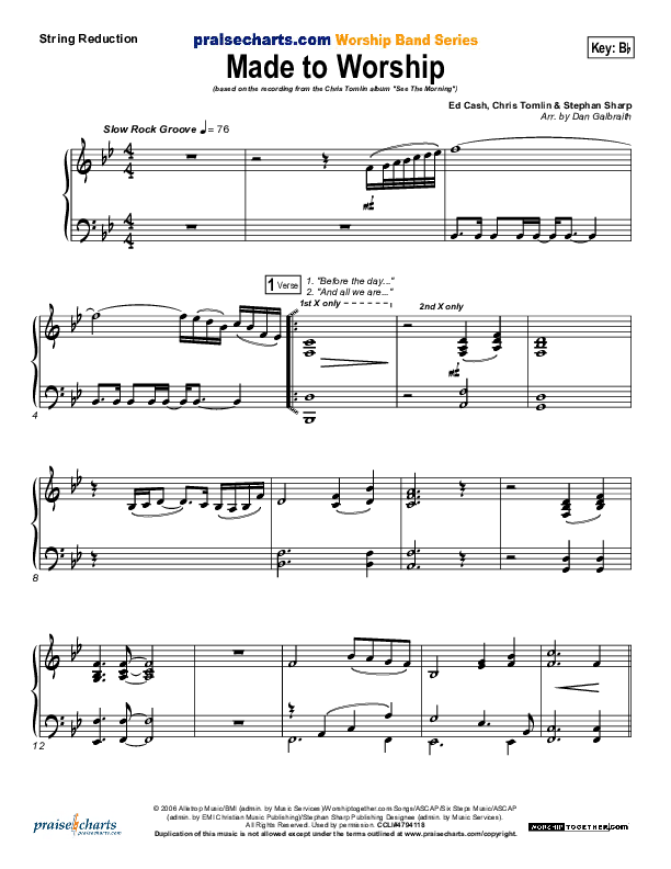 Download the Orchestration for Made To Worship by Chris Tomlin, from the album See The Morning. This song was arranged by Daniel Galbraith in the key of Bb, C.