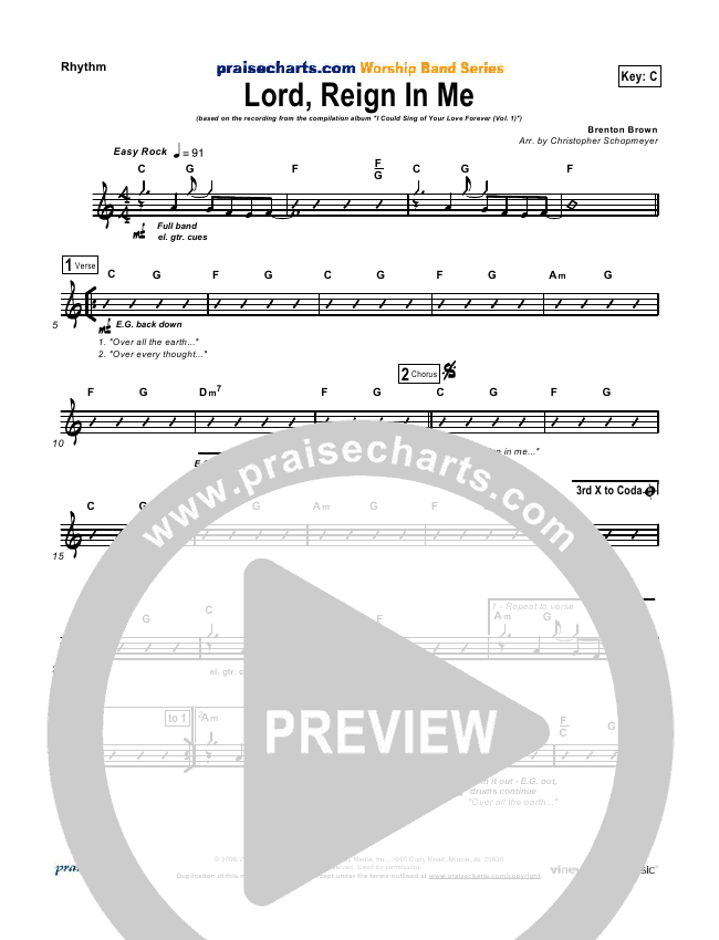 Download the Rhythm Chart for Lord Reign In Me by Brenton Brown, from the album WOW Worship Green. This song was arranged by Chris Schopmeyer in the key of C, D.