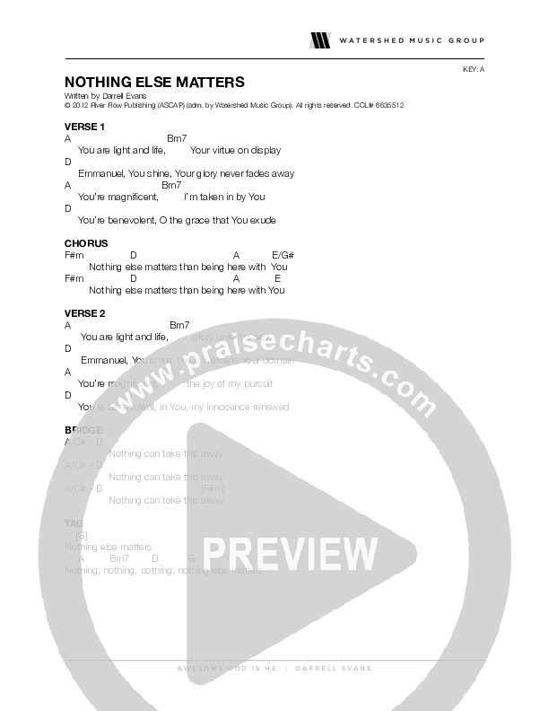 Download the PDF Chord Charts for Nothing Else Matters by Darrell Evans, from the album Awesome God Is He. This song was arranged by Watershed Music Group in the key of A.