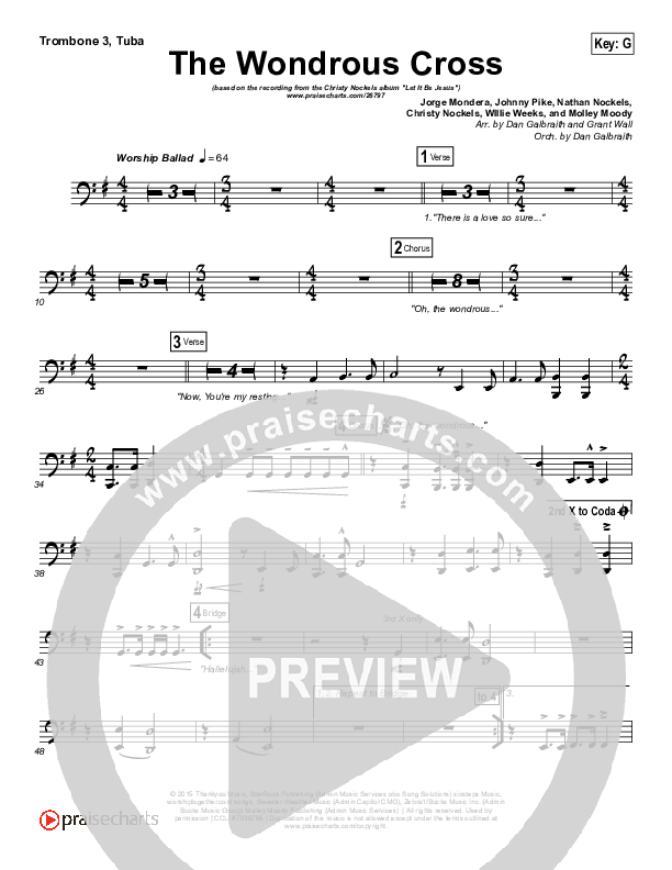 Download the Trombone 3/Tuba sheet music for The Wondrous Cross by Christy Nockels, from the album Let It Be Jesus. This song was arranged by Daniel Galbraith / Grant Wall in the key of A, G.
