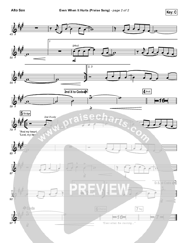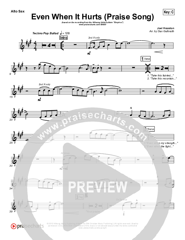 Download the AltoSax sheet music for Even When It Hurts (Praise Song) by Hillsong UNITED, from the album Empires. This song was arranged by Daniel Galbraith in the key of C, D.