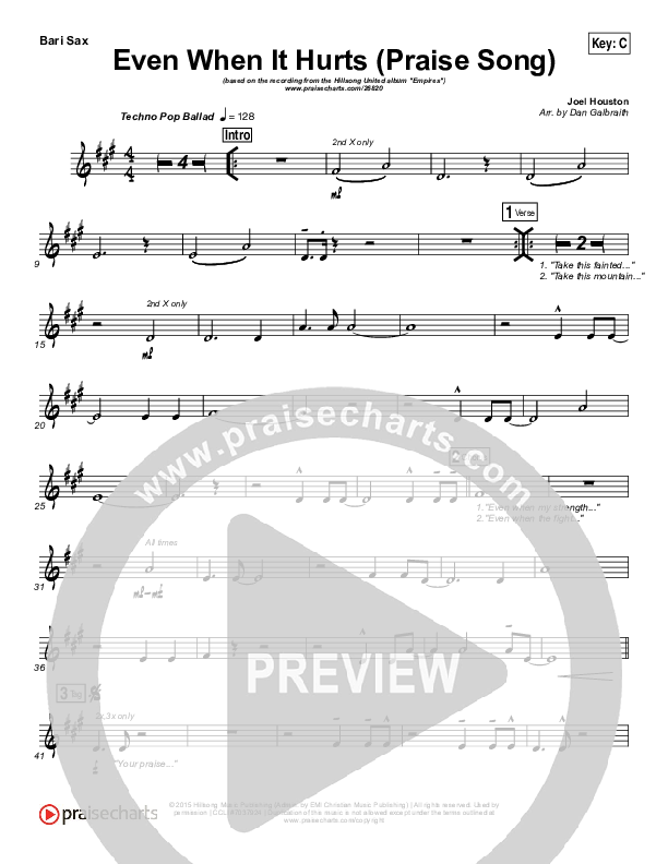 Download the Bari Sax sheet music for Even When It Hurts (Praise Song) by Hillsong UNITED, from the album Empires. This song was arranged by Daniel Galbraith in the key of C, D.