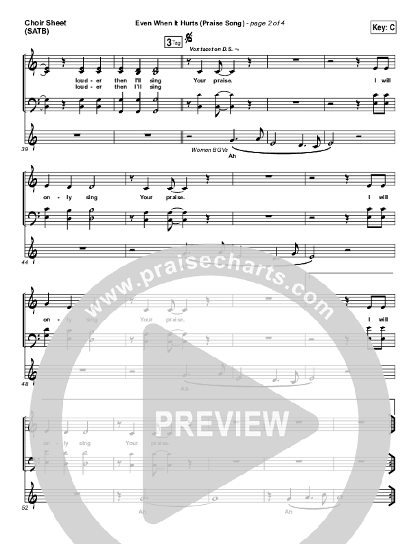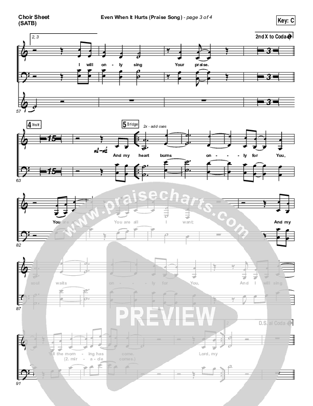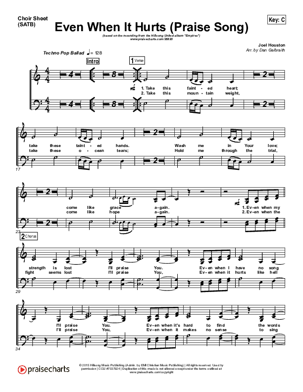 Download the Choir Sheet for Even When It Hurts (Praise Song) by Hillsong UNITED, from the album Empires. This song was arranged by Daniel Galbraith in the key of C, D.