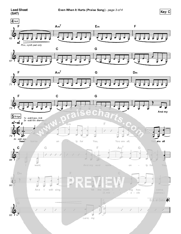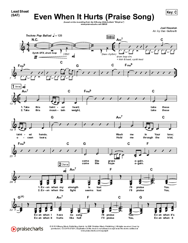 Download the sheet music for Even When It Hurts (Praise Song) by Hillsong UNITED, from the album Empires. This song was arranged by Daniel Galbraith in the key of C, D.