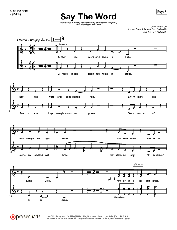 Download the Choir Sheet for Say The Word by Hillsong UNITED, from the album Empires. This song was arranged by Dave Iula / Daniel Galbraith in the key of F, G.