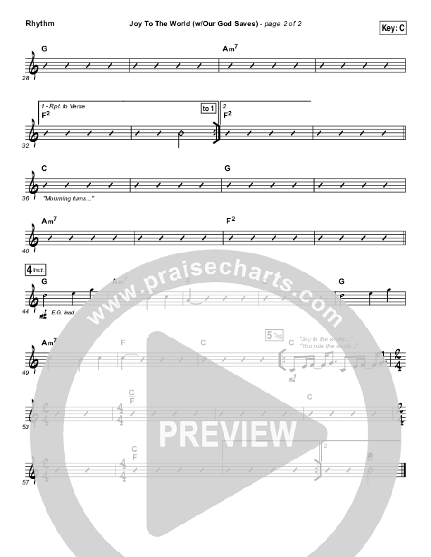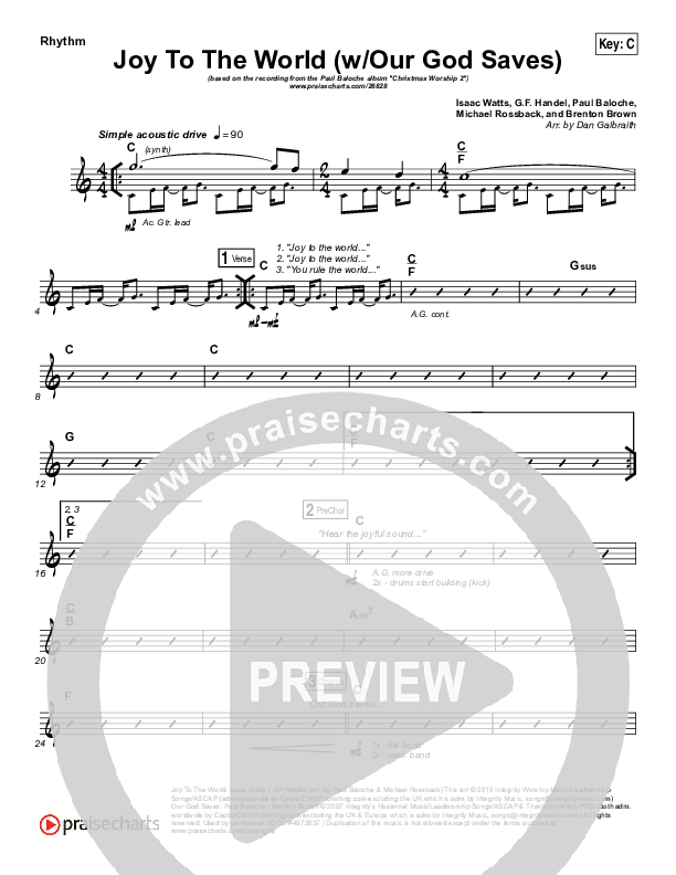 Download the Rhythm Chart for Joy To The World (Our God Saves) by Paul Baloche, from the album Christmas Worship 2. This song was arranged by Daniel Galbraith in the key of A, Ab, B, Bb, C, D, E, Eb, G.