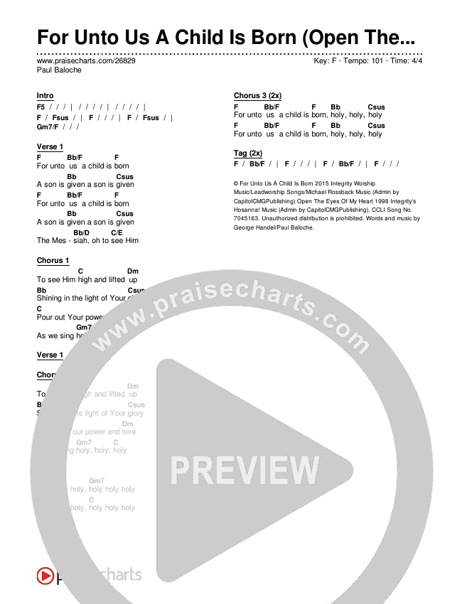For Unto Us A Child Is Born (with Open The Eyes Of My Heart Lord) Chords & Lyrics (Paul Baloche)