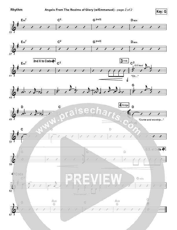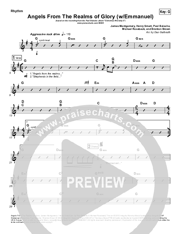 Download the Rhythm Chart for Angels From The Realms Of Glory (Emmanuel) by Paul Baloche, from the album Christmas Worship 2. This song was arranged by Daniel Galbraith in the key of A, Ab, Bb, E, Eb, F, G.