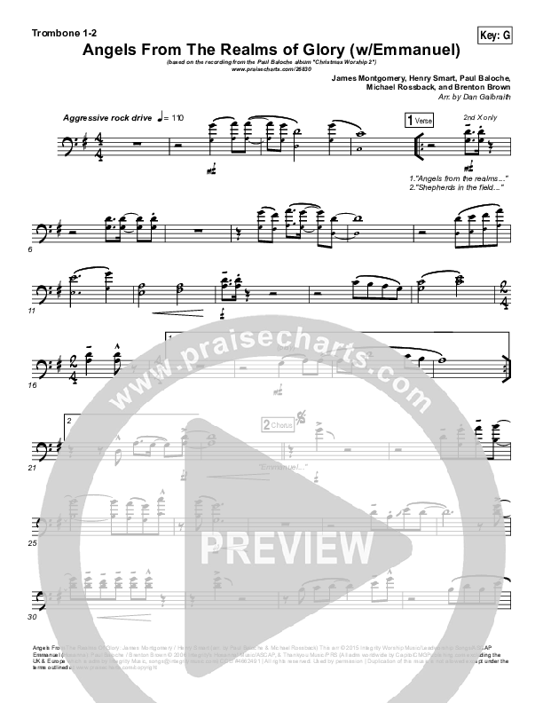 Download the Trombone 1,2 sheet music for Angels From The Realms Of Glory (Emmanuel) by Paul Baloche, from the album Christmas Worship 2. This song was arranged by Daniel Galbraith in the key of A, Ab, Bb, E, Eb, F, G.
