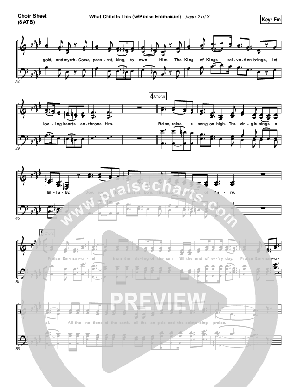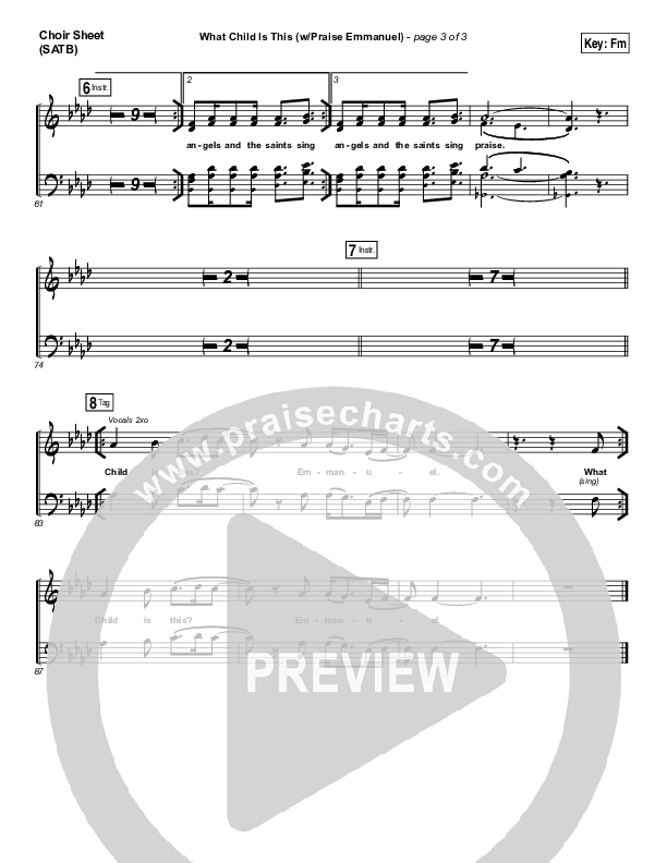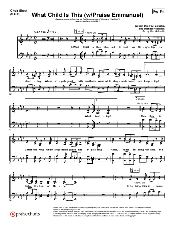 Download the Choir Sheet for What Child Is This (Praise Emmanuel) by Paul Baloche, from the album Christmas Worship 2. This song was arranged by Daniel Galbraith in the key of Em, Fm.
