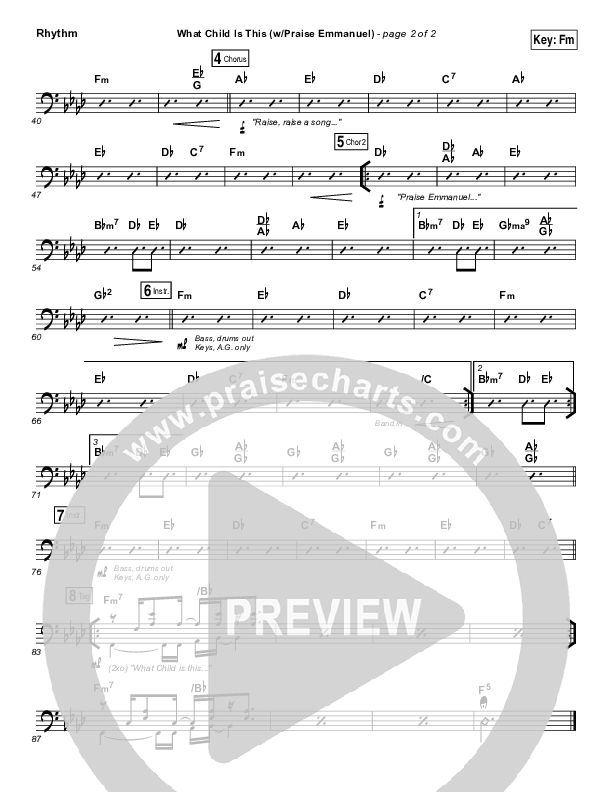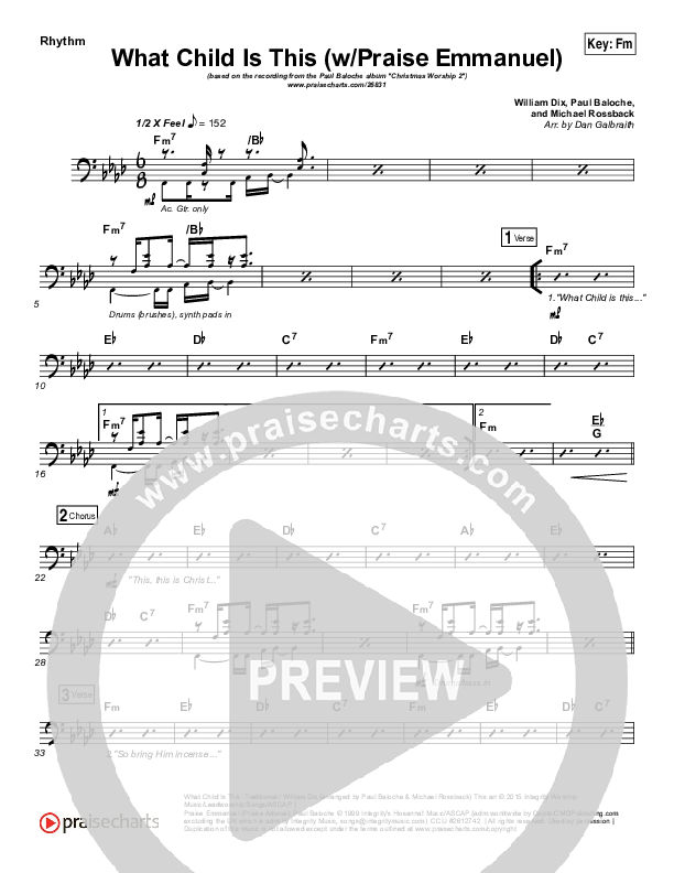 Download the Rhythm Chart for What Child Is This (Praise Emmanuel) by Paul Baloche, from the album Christmas Worship 2. This song was arranged by Daniel Galbraith in the key of Em, Fm.