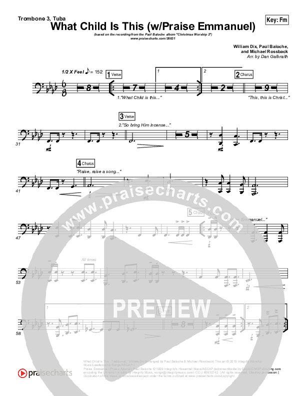 Download the Orchestration for What Child Is This (Praise Emmanuel) by Paul Baloche, from the album Christmas Worship 2. This song was arranged by Daniel Galbraith in the key of Em, Fm.