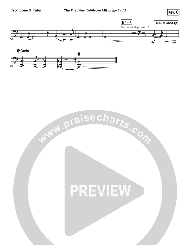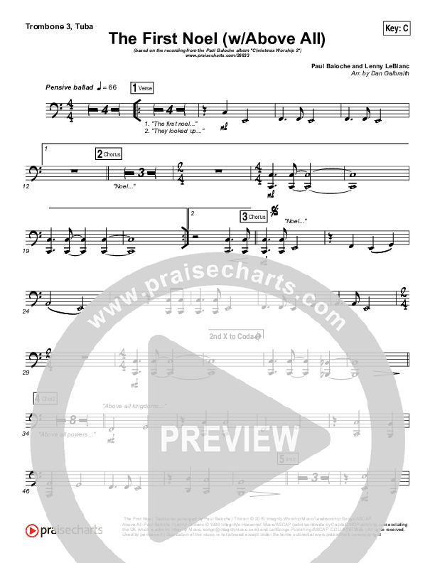 Download the Trombone 3/Tuba sheet music for The First Noel (Above All) by Paul Baloche, from the album Christmas Worship 2. This song was arranged by Daniel Galbraith in the key of B, Bb, C.